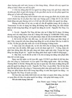 Để đảm bảo quyền lợi cho chị Nguyễn Thị Thuy, anh Phạm Văn Trường đã gửi đơn đề nghị Công ty Tranconsin và Cục Quản lý lao động ngoài nước yêu cầu giải quyết, tuy nhiên cho đến nay cả 2 đơn vị này vẫn chưa giải quyết quyền lợi cho người lao động đúng quy định pháp luật.